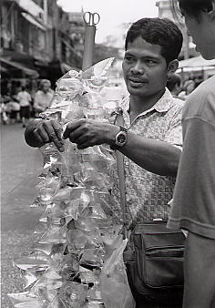 商売は金魚売り。たくさんの金魚の袋を棒にくくりつけて、街を練り歩きます