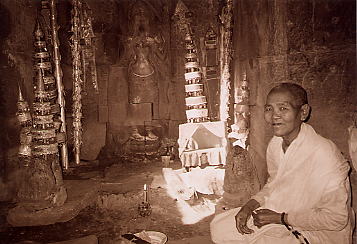 瓦礫に埋もれたアプサラ像を一人守る老尼僧。一条の光が射していた