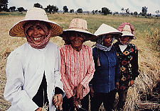 農村では土地を持たない農民が増えつつある。モーン・ブーンさん(左端)は、一日約100円で雇われて働く農業労働者だ