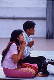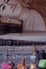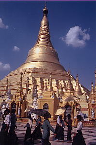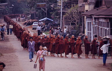 早朝、僧侶の托鉢を知らせる鐘が鳴り響く。檀家はぞうりを脱ぎ、ご飯やおかずを僧侶の黒い器に入れる。ビルマはこんな調子で一日が始るのだ。そして一年は仏教行事で回っている。新年を祝う水かけ祭り、ブッダが悟りをひらいた日、僧院にお布施をする日……若いカップルのデートがパゴダ(仏塔)なんてあたりまえ。私の友人は僧院で出逢った男性と結婚したのだ。石を投げればパゴダか僧侶に当るほど、そこいらに仏教を感じることができるだろう。テレビのニュースや新聞のトップ記事が「軍政府の幹部が僧院に多額のお布施をしました」なのだから。他にニュースはないのか?と突っ込みたくなるほどだ。