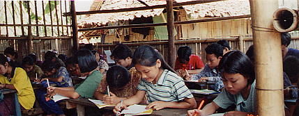 今年三月、ボランティアと私がメラキャンプを訪れた日は日曜日だったが、子どもたちは教室でポー・カレン語の特別授業を受けていた。サタトゥク仏教学校の教室は二〇人ぐらいが座れるくらいの大きさでいくつかに仕切られていた。若い先生が黒板の文字を棒で指す。子どもたちが指された文字を大きな声で復唱していく。どの子もどの子も元気いっぱい。見せてもらっている私たちは子どもたちの元気をいっぱいもらう。