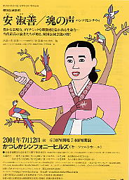 | ●東京・福岡● 国際交流基金アジアセンター 「アジア演劇の女形」 インド◇ゴパール・ドゥベイ(セライケラのチョウ)/インドネシア◇ディディ・ニニ・トウォ(ジャワ舞踊)/中国◇趙志剛(越劇)/日本◇五條雅之助(日本舞踊) アジアの演劇・舞踊劇の伝統形成においては、女形が大きな位置を占めてきた/その中で代表的な、インドの仮面舞踊「セライケラのチョウ」、インドネシアのジャワ舞踊、中国の「越劇」、日本舞踊を取り上げ、それぞれの様式の中で女形がどのような役割を果たしているのかを探る ▼東京【会場】国際交流基金フォーラム ◆ガラ公演【6月21日(木)】19・00〜21・00 出演◇ゴパール・ドゥベイ(インド・セライケラのチョウ)/ディディ・ニニ・トウォ(インドネシア・ジャワ舞踊)/趙志剛(中国・越劇)/五條雅之助(日本・日本舞踊) ![]() ![]() ![]() ![]() ◆レクチャー・デモンストレーション【6月22日(金)】19・00〜21・00◇ディディ・ニニ・トウォ(インドネシア)/モデレーター・風間純子(中京女子大学助教授・アジア芸能)【6月23日(土)】14・00〜16・00◇ゴパール・ドゥベイ(インド)/モデレーター◇リチャード・エマート(武蔵野女子大学教授・アジア演劇)17・00〜19・00 趙志剛(中国)/モデレーター◇細井尚子(立教大学助教授・中国演劇)/コーディネーター◇張志凡19・00〜20・00★スペシャル・トーク(4カ国出演者による女形談義) ◆ワークショップ 【6月24日(日)】10・00〜12・30◇ディディ・ニニ・トウォ(インドネシア)/13・30〜16・00◇ゴパール・ドゥベイ(インド)/17・00〜19・30◇趙志剛(中国) 【料金】◆ガラ公演/前売3000円・当日3500円◆レクチャー・デモンストレーション/各回1500円/3回通し券3500円◆ワークショップ/各回3000円・見学500円・3回通し券7000円(スペシャル・トークは、レクチャー・デモンストレーションの半券をお持ちの方のみご入場いただけます)【主催/チケット/問合先】国際交流基金アジアセンター/「アジア演劇の女形」事務局tel03・3589・6554 ▼福岡【会場】NTT夢天神ホール ◆解説&公演【6月26日】19・00〜21・00【出演】ゴパール・ドゥベイ(インド)/ディディ・ニニ・トウォ(インドネシア)/趙志剛(中国)/解説◇リチャード・エマート(武蔵野女子大学教授・アジア演劇)【料金】前売2000円/当日2500円【問合先】(財)福岡市文化芸術振興財団事業係tel092・263・6265 ●台湾少数民族サミンガ/ライブ Samingad(サミンガ)中国語名・紀暁君/サミンガただひとつだけ≠フ声を持つ太陽の歌姫/99年のフェスティバル・コンダ・ロータで絶賛を得た台湾・卑南(ピュマ)族の天才少女¢メ望の単独公演 【6月28日(火)】18・00開場19・30開演【料金】自由席/当日7000円/前売6500円/BOX席9000円(相席の場合もございます)3名BOX席25000円【会場】TRIBUTE TO THE LOVE GENERATION(お台場/港区台場1・7・1メディアージュ6F/ゆりかもめ「台場」駅・「お台場海浜公園」駅3分)【主催/チケット/問合先】TRIBUTE TO THE LOVE GENERATION&ビジネス・エイト・クリエーション/tel03・5531・2025/03・5562・0808 ●東京・大阪●PURIプリ日本公演「MOVEMENT」 「打楽器の鬼才たち」PURIは、人気・実力とも韓国bPスーパー・パーカッション・グループ/韓国国楽とロック、ジャズ、ラテンのリズム要素が融合!独自の表現と感性が世界の注目を集める!/「打楽器の鬼才たち」の血沸き肉踊るエネルギッシュなライブ/日本デビューアルバム「移動」もゆうげい社より発売/待望の日本公演 ▼東京【6月15日(金)】開演19・00【会場】世田谷パブリックシアター【料金】前売4000円・当日4500円【共催】くりっく世田谷文化生活情報センター・カンバセーション【問合先】カンバセーションtel03・5280・9996 ▼大阪【6月17日(日)】開演19・00【会場】心斎橋クラブクアトロ【料金】前売4000円・当日4500円(1ドリンク付)【主催】カンバセーション【問合先】カンバセーションtel03・5280・9996、心斎橋クラブクアトロtel06・6281・8181 ●横浜●インド舞踊ワークショップ 南インド古典舞踊バラタナティヤム インド舞踊家エミ・マユーリによるダンス・ワークショップとそれに伴うダンスパフォーマンスとデモンストレーション/ダイナミックで優雅なインド舞踊バラタナティヤムをオリエンタルムード溢れる横浜中華街で、体験してみませんか/男性も女性も、子供も大人も気軽にいらしてください! ▼【6月3日(日)】15・30ダンスパフォーマンスとワークショップの説明のみ/チケット1000円 ▼【6月10日(日)・17日(日)・24日(日)】14・30〜16・00ワークショップ各1日1500円 ▼【7月1日(日)】15・30ダンスパフォーマンスとワークショップの説明のみ/チケット1000円 ▼【7月8日(日)・15日(日)・29日(日)】14・30〜16・00ワークショップ各1日1500円 【会場】横浜市中華街・南門シルクロード「シルクロード舞踏館」【持ち物】ワークショップのときは運動のできる服装または着替えをお持ち下さい【主催/問合先】DeviDeviエミ・マユリーtel090・8489・3702 ●日本・コリア音楽祭2001 「海を越えて」 ソプラノ◇チョン・ウォルソン/テノール◇五十嵐修/バリトン◇大久保真/