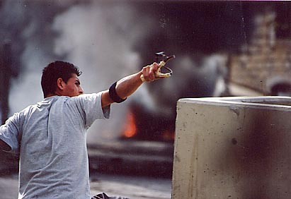 パチンコでイスラエル軍兵士に立ち向かうパレスチナの若者