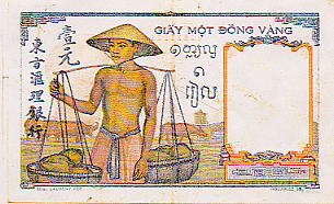 旧フランス支配下で流通していたインドシナのピアストル紙幣。ベトナム語、クメール語(カンボジア語)、ラオス語、漢語の各文字で記されている