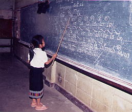 ラオスの小学校で、先生が黒板に書いたラオ文字を一文字一文字発音していく小学生。正解すると児童全体が拍手する。ビエンチャンの公立小学校で