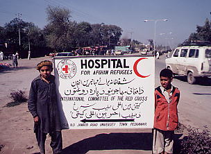 パキスタン北西部辺境州ペシャワルにある、アフガン難民を収容する病院の看板。英語以外にアラビア語とアフガニスタンのパシュトゥーン語が記されていた