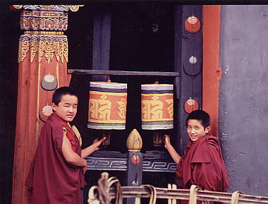 チベット仏教の信仰に篤いブータンの国には、歴史ある古寺が多い。マニ車を一回回すと、経典を一回読んだことになり、少年僧たちも楽しそうに回す。マニ車に記されているのは、ゾンカ語(ブータンの言葉)。ブータン、ブムタン郊外で