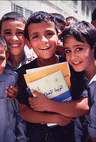 ヨルダン・アンマンの小学生たち。授業を終えた子供たちは、アラビア文字で記された教科書やノートをだいじに抱えて家路につく