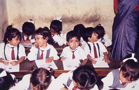 楽しそうに友だちとネパールの文字を勉強する子供たち。制服がよく似合う。