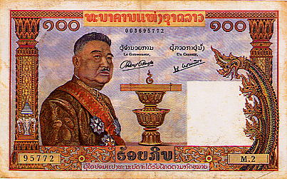 旧ラオス王国の紙幣。ラオス文字にナーガ(蛇神)の模様が美しい