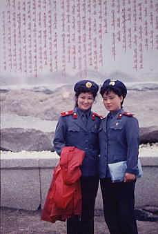 白頭山(ペクトウサン)は、朝鮮民族の聖地。ハングルの碑文の前で、明るい笑顔で記念写真を撮る女性人民兵士。