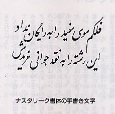 問題は二つ目の理由、「書体」なんである。ペルシャ語の教科書や辞書、新聞などに使われている書体、ナスヒー書体という。まあ明朝体みたいなもんだ、ユニコードにも入ってるし、マックのランゲージキットにも入ってる。そいつを三年間読み続けてきた。どっこい本場にゃそれからかけ離れた書体が鬼のようにあったのだ。同じ文字とは思えない崩しっぷり。主犯はナスタリーク書体。ほら、日本でも鰻屋とか、崩し字で書いてあるじゃないですか。あれです、あれ。あんな感じ。市街の文字の五割が草書体で埋め尽くされていると考えて下さい。道路名表示もナスタリーク書体。パキスタンでは新聞すらもナスタリーク書体だという噂もある……。辞書を開こうにも文字が流れちゃって判別できない。イランでは小学校でナスタリーク書体の授業があるとか。あるだろう、そりゃ。ちょっと勉強すれば読めるとも言うけれど……。ワタクシは呆然と路傍に立ちつくしたのであった。