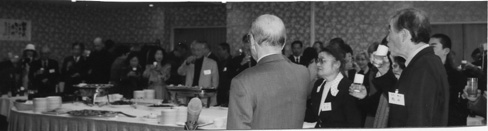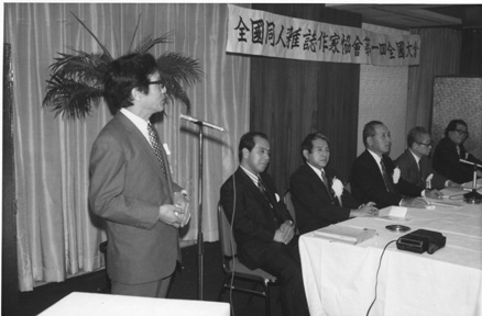 1975第1回全国同人雑誌作家協会の総会。座っている左から森啓夫、作家の水上勉、会長の丹羽文雄