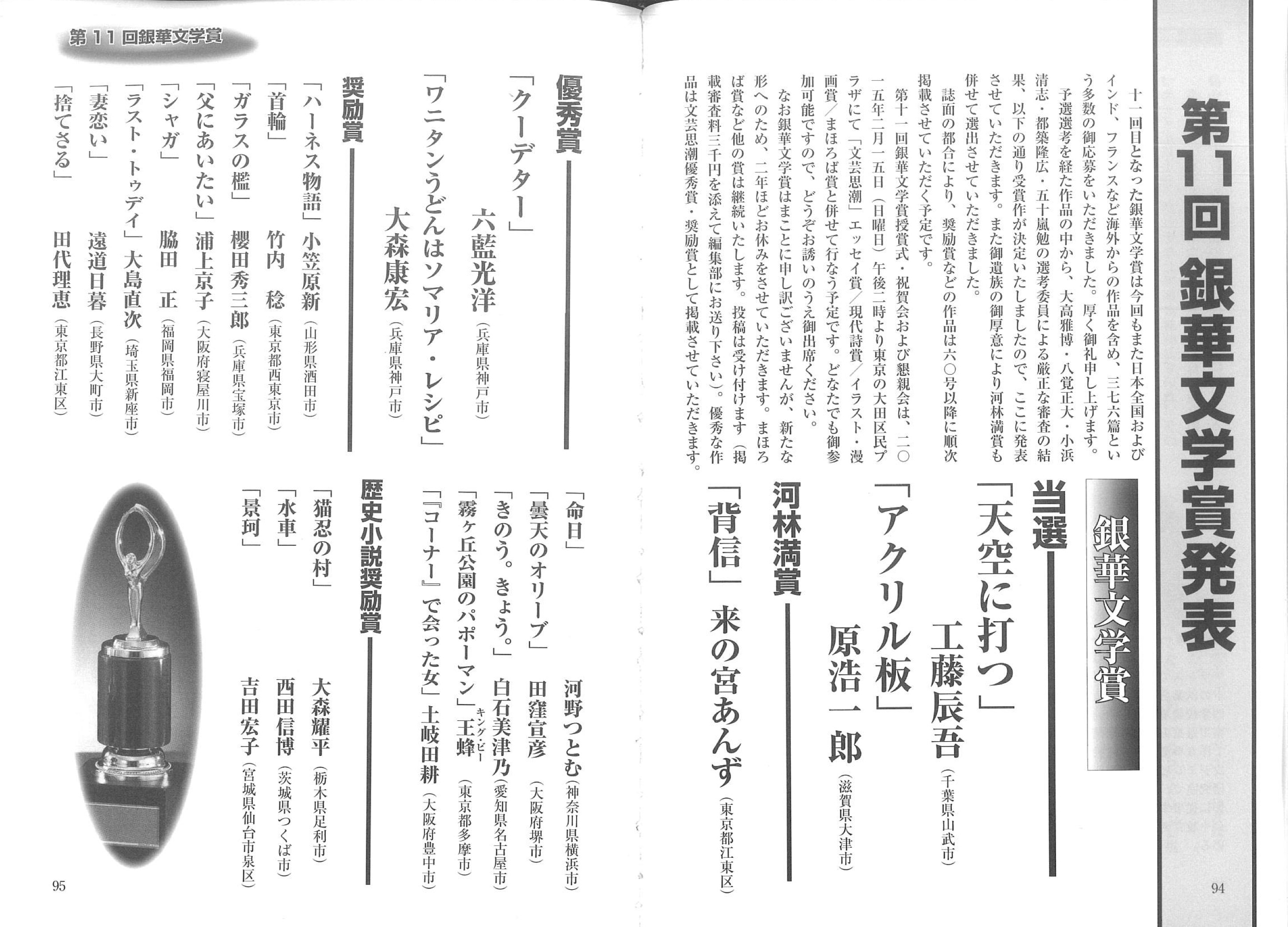 | 文芸思潮 銀華文学賞 当選作• 最優秀作・優秀作の 作品 |