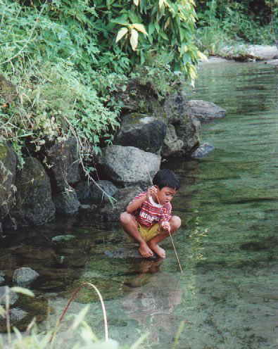 魚を捕りに行った父を待っている少年。そして、少年も父を真似て魚捕りのまねごと。